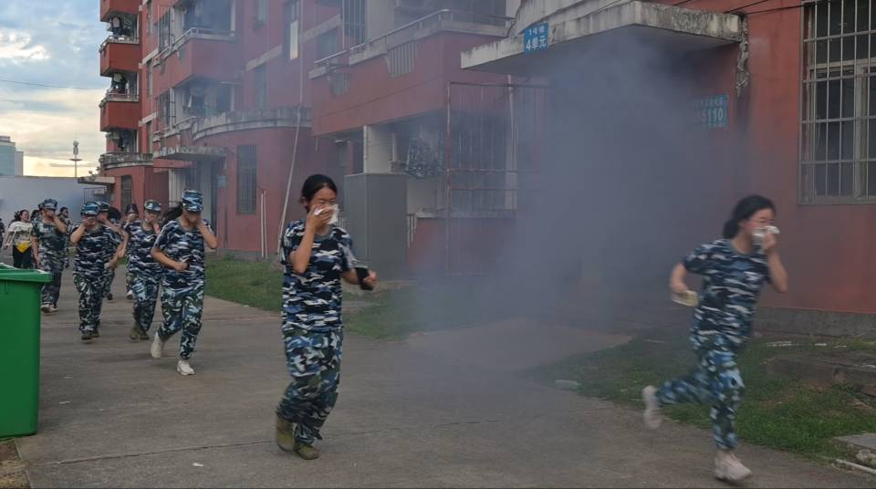 紧接着,逃生演练启动,宿舍楼警报响起、浓烟弥漫,新生用湿毛巾捂口鼻,低姿弯腰沿预定路线有序撤离至安全地点。